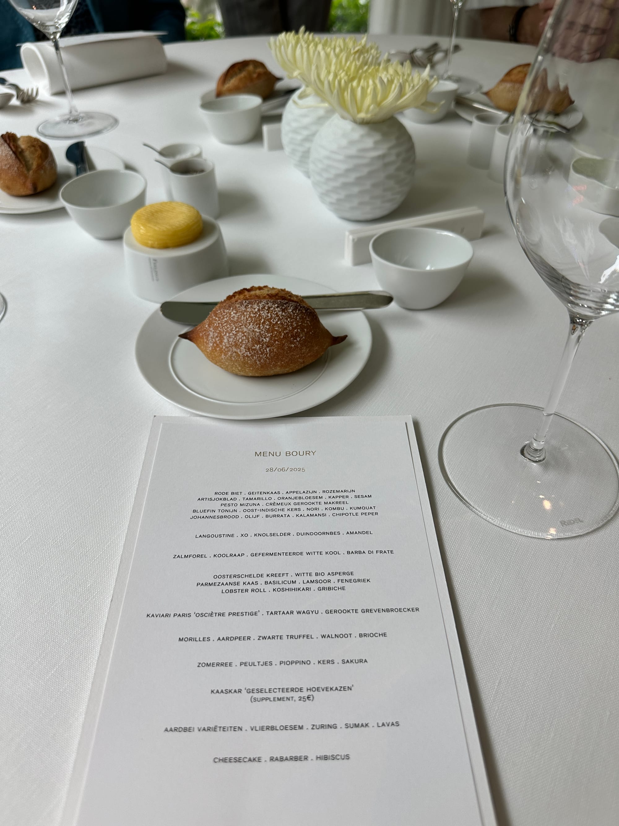 The setting for the Boury gastronomic experience is a beautifully restored 1950s villa near the heart of Roeselare. Surrounded by a lush garden, the property immediately evokes a sense of welcome and tranquility. We began our visit on the serene outdoor terrace, which overlooks a striking stainless-steel open kitchen and bar—an elegant space where pre- and post-meal drinks are served, weather permitting, with a view of the culinary activity.