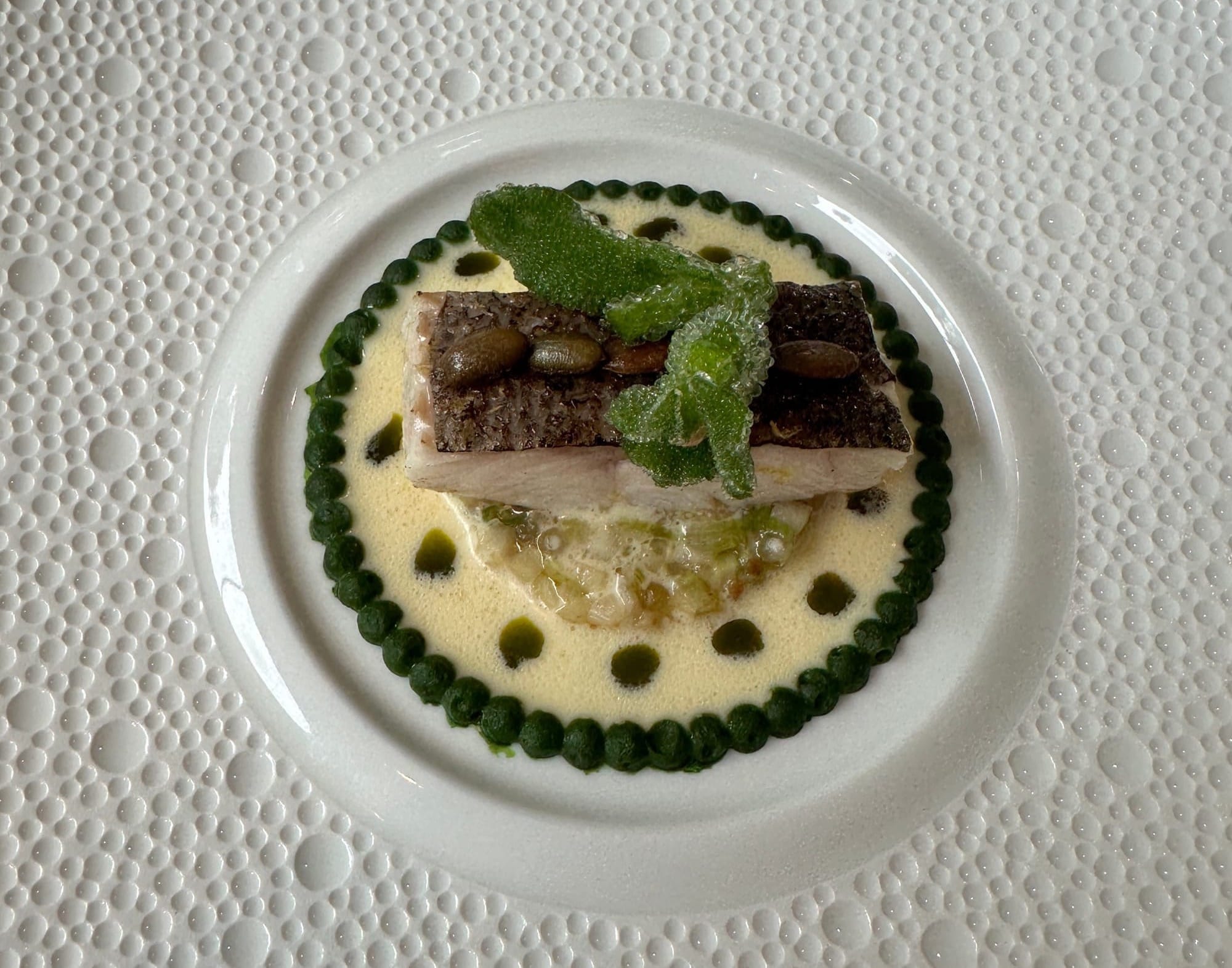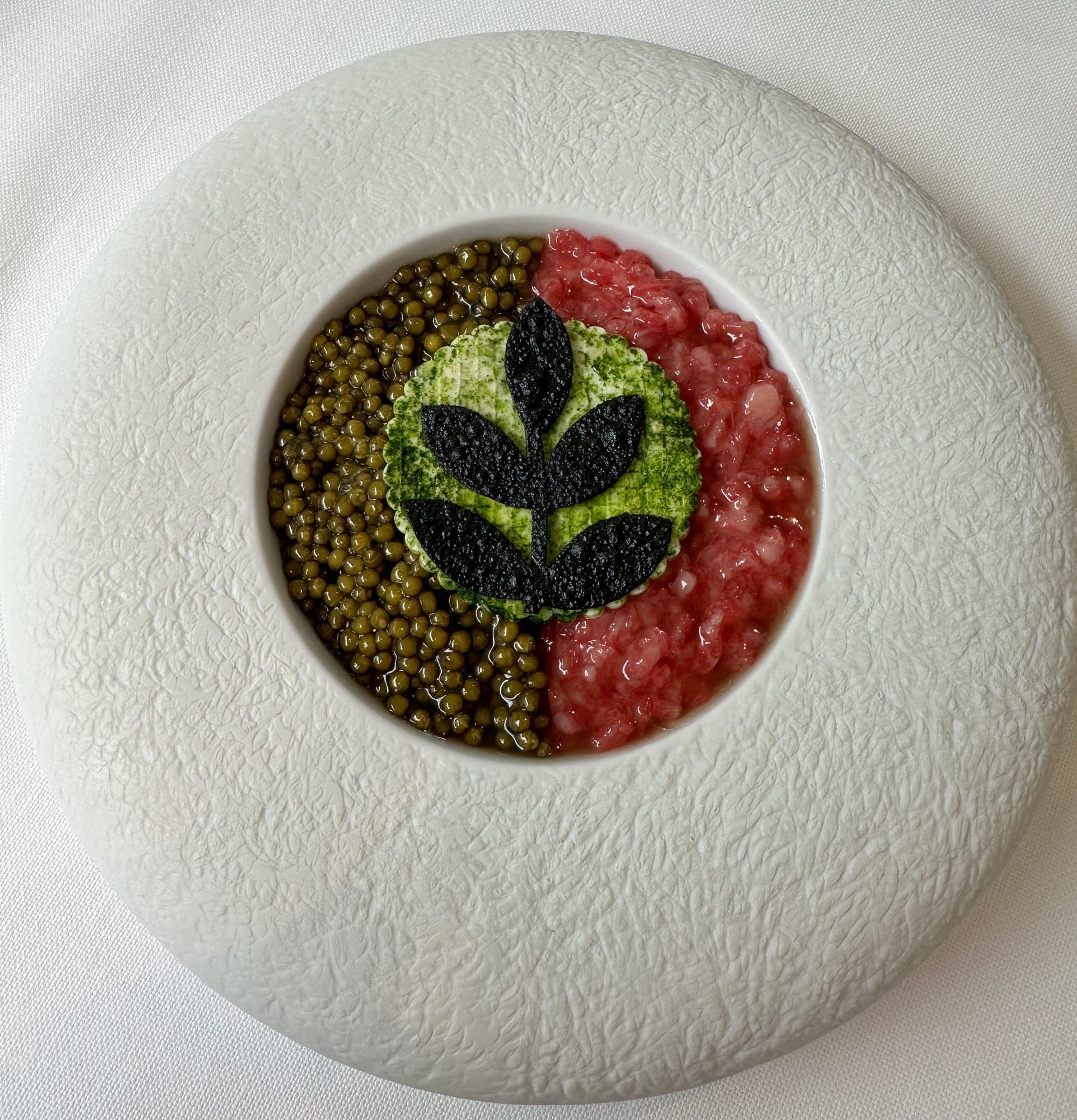 Despite the gentle summer breeze, we settled comfortably on the terrace and commenced our journey with a glass of champagne. A generous selection of amuse-bouches followed, featuring bluefin tuna, crab with calamansi, and pesto mizuna with smoked mackerel—each bite a preview of the precision and creativity to come.