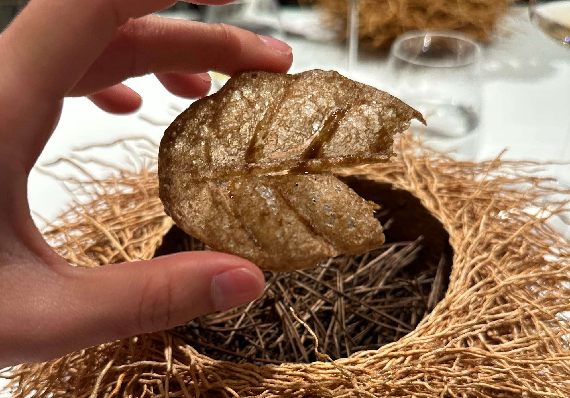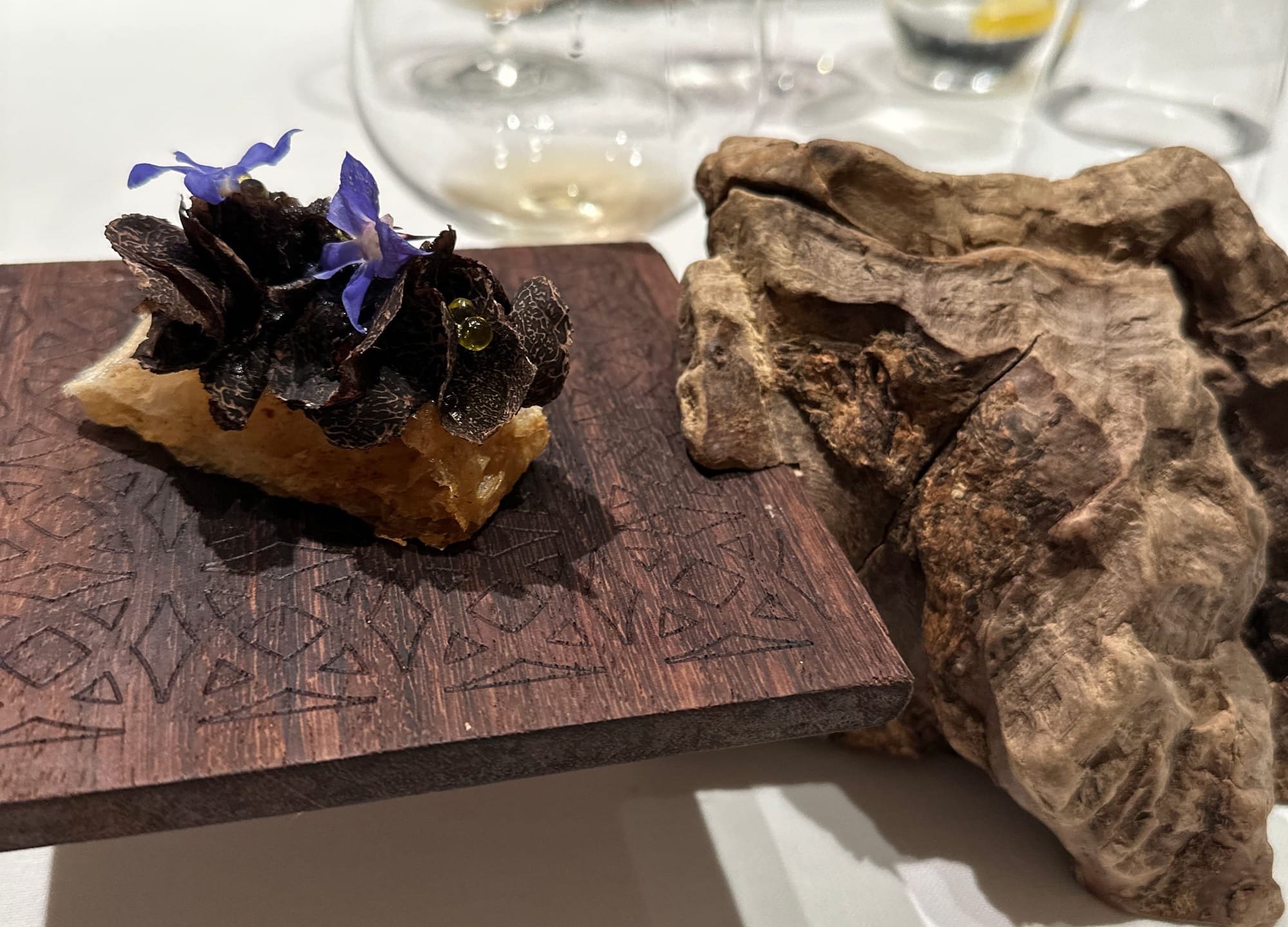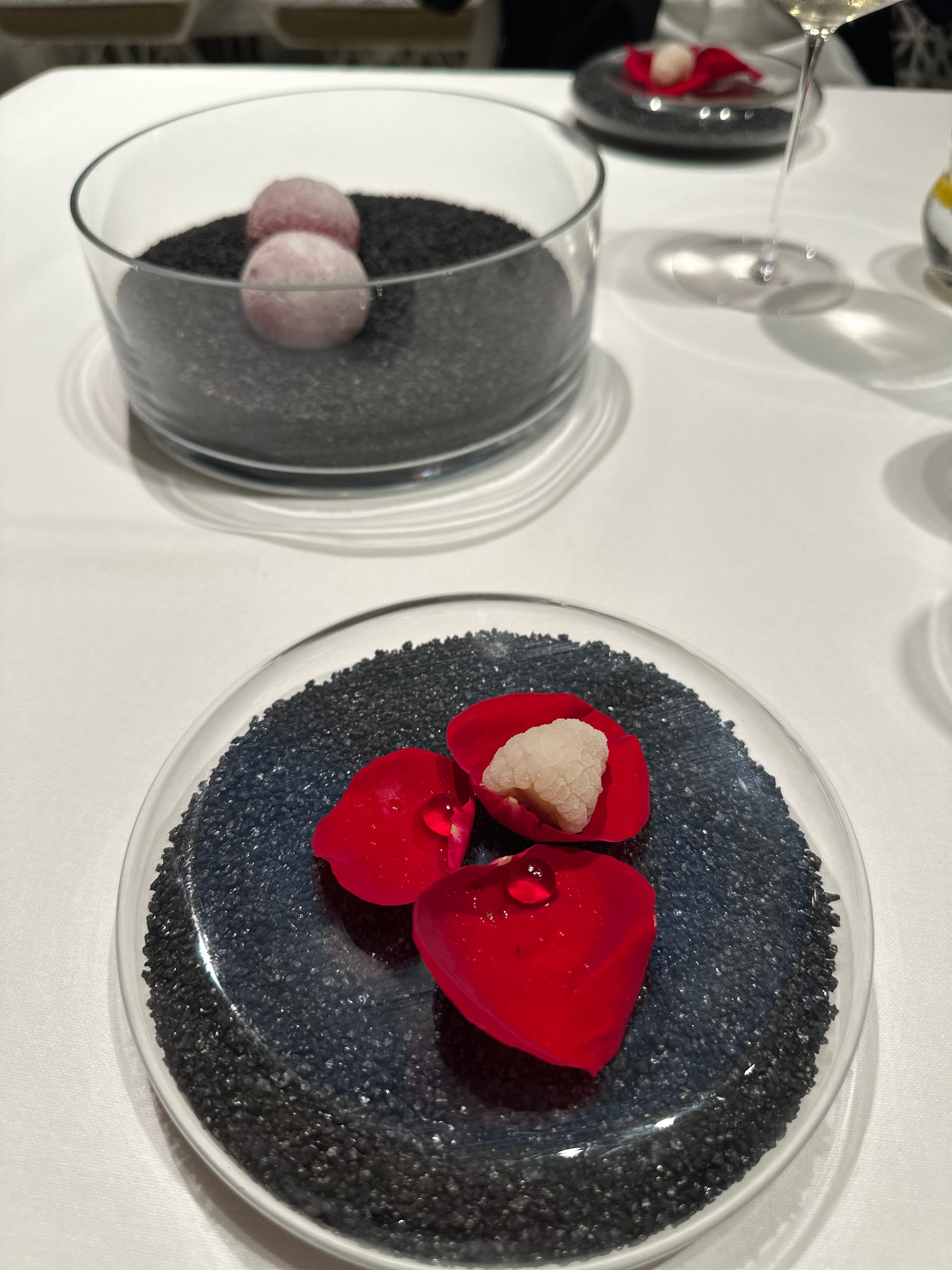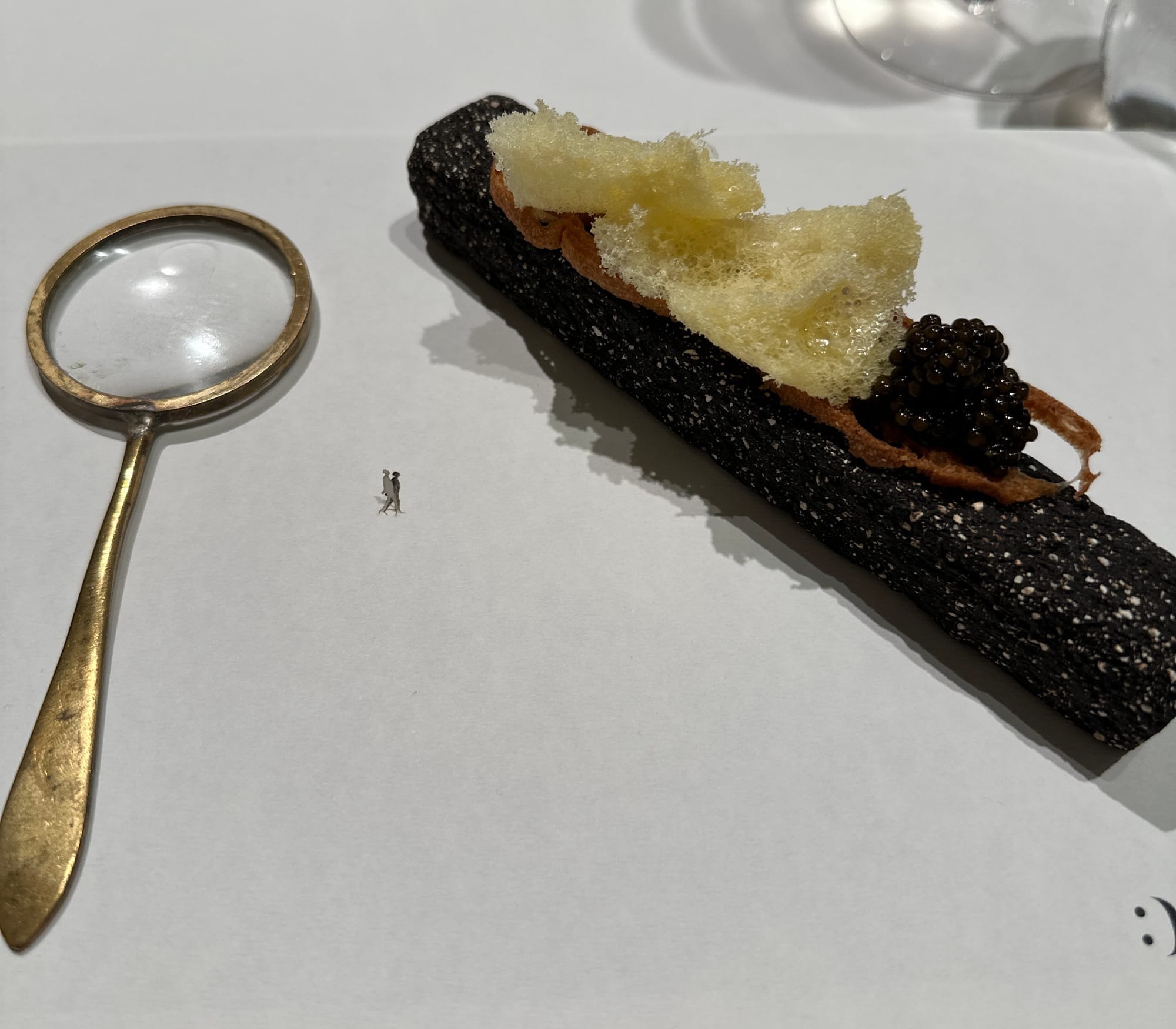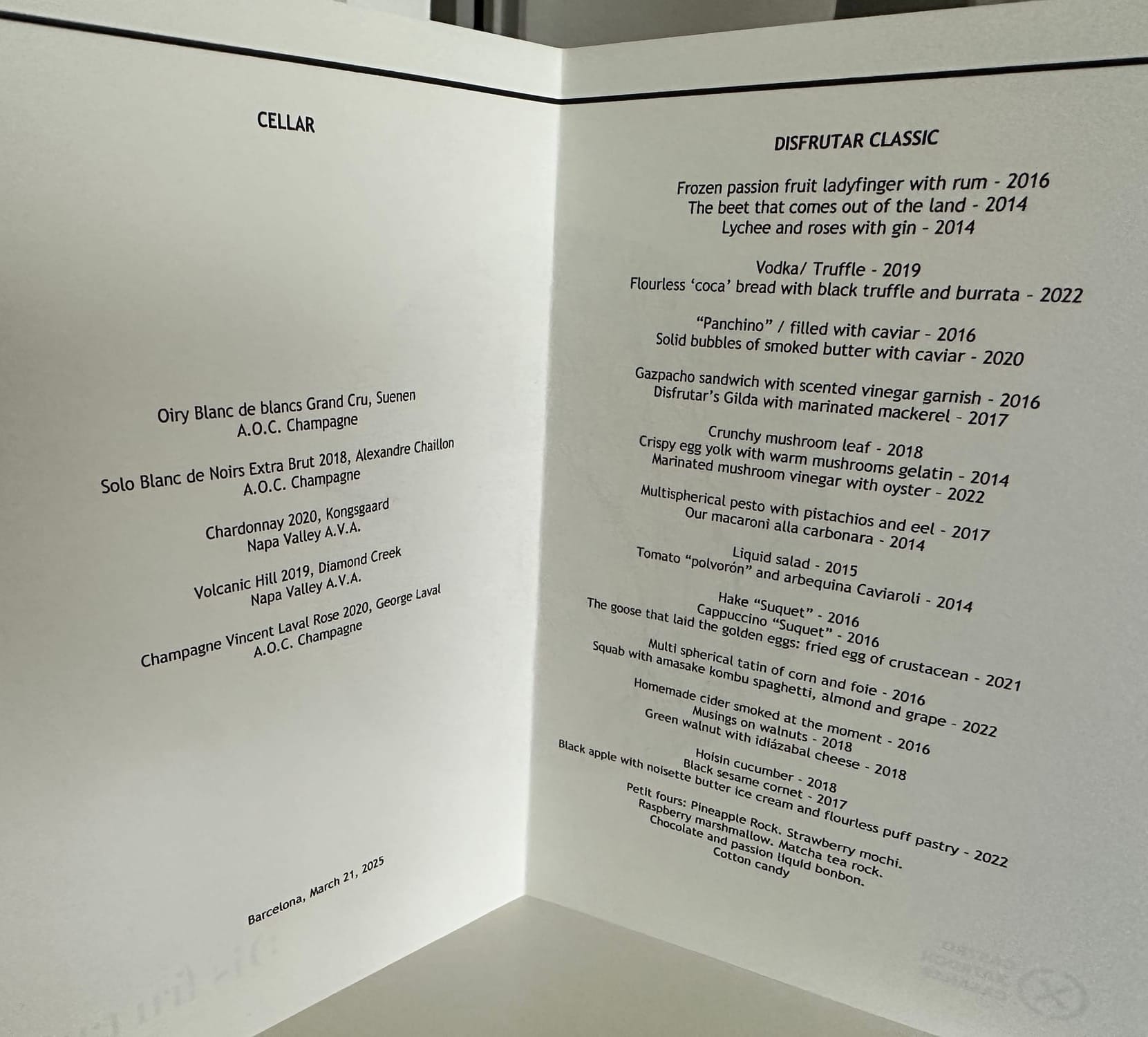 The restaurant offers two distinct tasting menus. The Classics menu features 28 of the most iconic dishes that have defined Disfrutar’s reputation, while the Festival menu showcases the team’s latest culinary innovations. As first-time guests, we chose the Classics menu—and it proved to be an extraordinary decision. Each course was a testament to creativity, technical mastery, and artistic expression. The dishes were not only visually captivating but also diverse and imaginative in concept and execution.